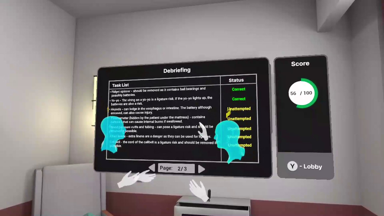 Developed a multiplayer VR training simulation in partnership with Mount Sinai Health System to train healthcare professionals in identifying and mitigating potential risks in hospital rooms for patients at risk of self-harm. This photorealistic collaborative environment enables real-time teamwork in safety assessment.